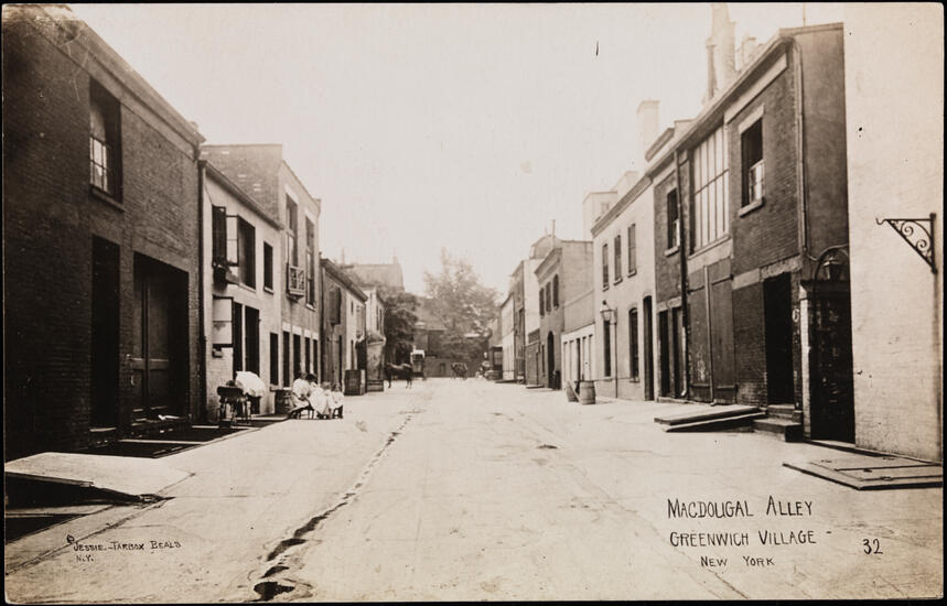 Macdougal Alley. Greenwich Village. Former stables, now artists studios. Tall building #1 Fifth Avenue. Apartment hotel.