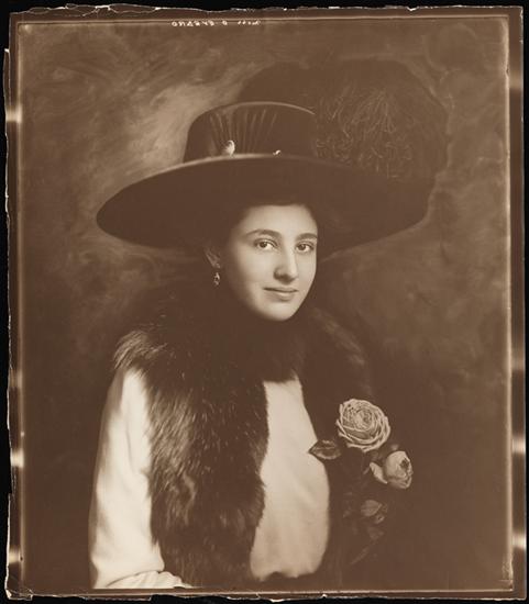 [Unidentified woman in bejeweled dress and fur stole, displaying wedding ring]