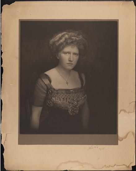 [Unidentified woman with corsage, pearl necklace, landscape backdrop]