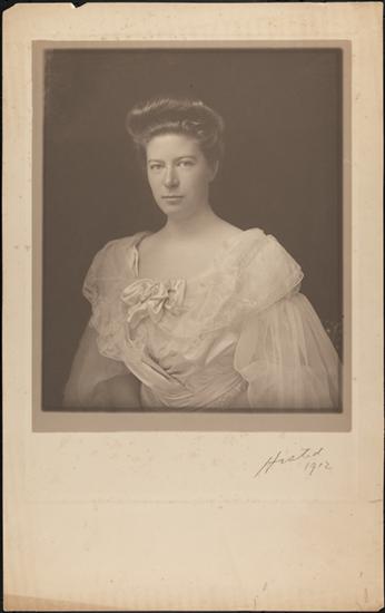 [Unidentified woman in satin dress wearing gloves, a choker, and large hat, with landscape backdrop]