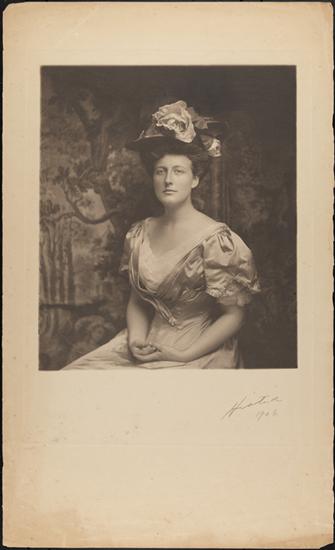 [Unidentified woman in satin dress wearing gloves, a choker, and large hat, with landscape backdrop]