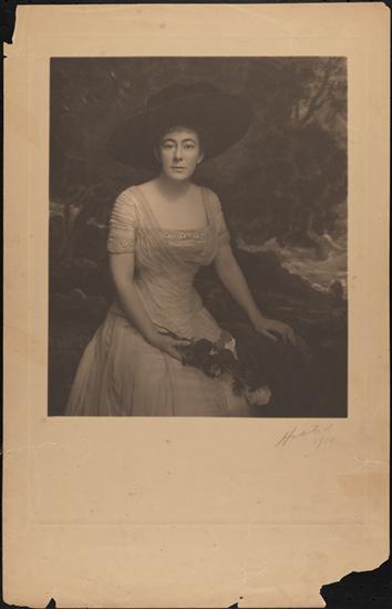 [Unidentified woman in satin dress wearing gloves, a choker, and large hat, with landscape backdrop]