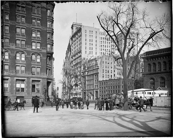 [Benjamin Franklin statue opposite City Hall, milk cart sitting adjacent]