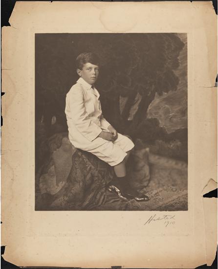 [Two unidentified children sitting with a stuffed animal in front of a landscape backdrop]