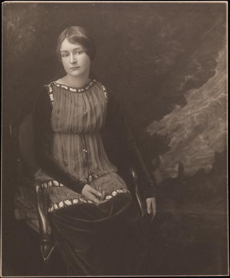 [Unidentified woman in square décolleté dress, three-quarter view]