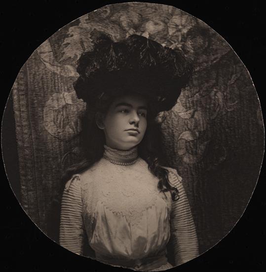 [Unidentified woman in satin dress wearing gloves, a choker, and large hat, with landscape backdrop]