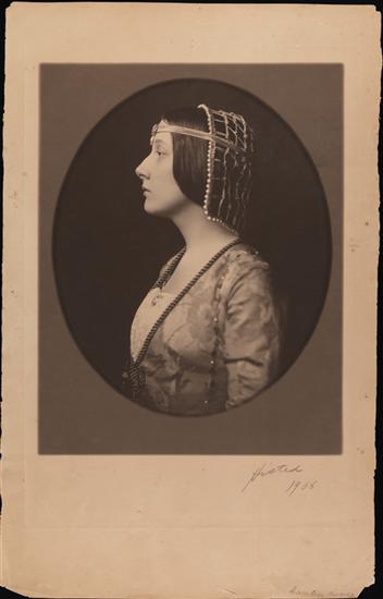[Unidentified woman in square décolleté dress, three-quarter view]