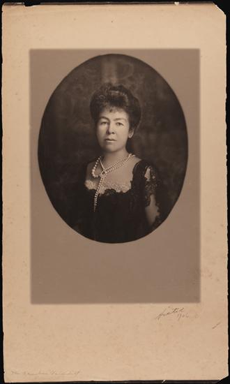 [Oval portrait of a woman in a white dress with a landscape backdrop]