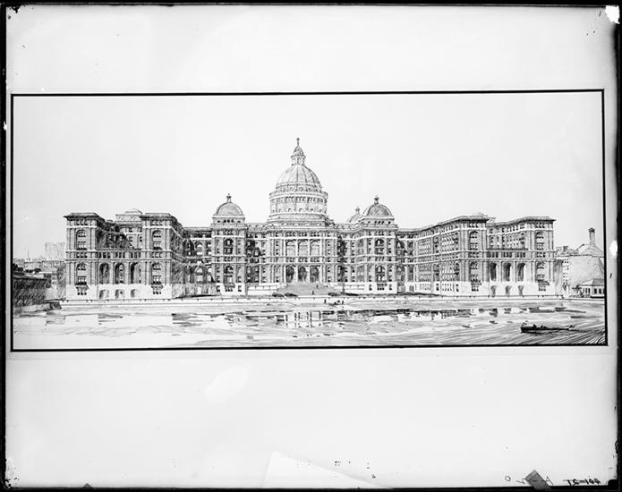 Bellevue Hospital, rendered perspective of facade by Jules Crow.