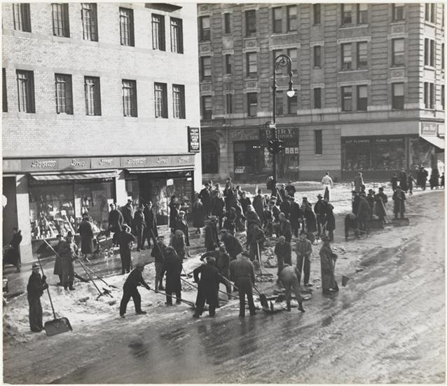"Neither Sleet nor Snow," snow scene looking out of store window, east side of Madison Avenue between 96th and 97th Streets.
