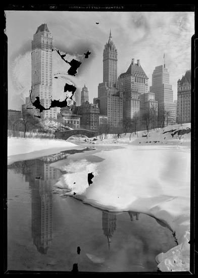 New York City views. 59th Street buidlings over frozen lake, horizontal.
