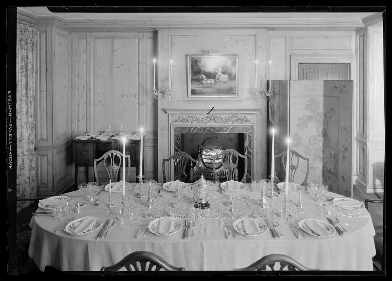 Carroll Carstairs [residence]. Dining room table set with candles lighted, light effect.
