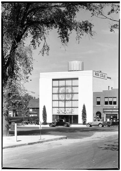 Rex Cole [showrooms]. Sharp view of entrance with cedars.