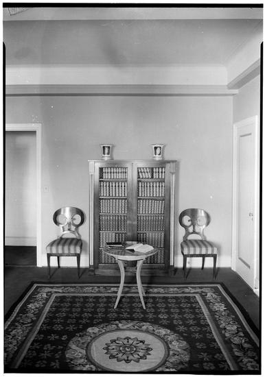 E. E. Gauche [residence]. Direct view of fireplace & book cabinets.