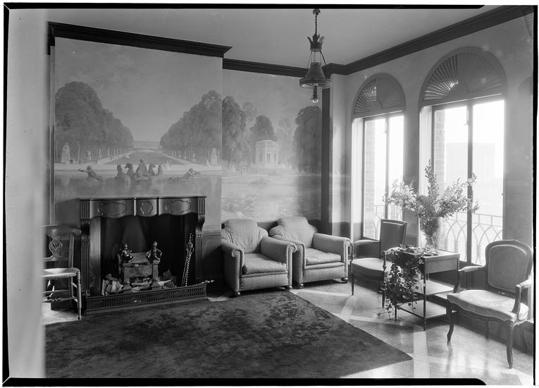 Faris R. Russell [residence]. Living room to fireplace.