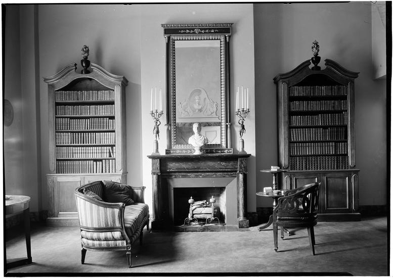 E. E. Gauche [residence]. Direct view of fireplace & book cabinets.