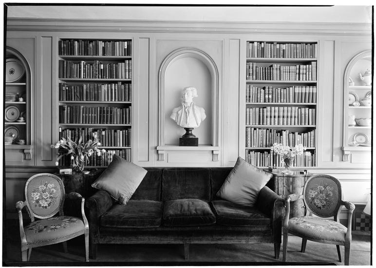 Samuel L. M. Barlow [residence]. China cupboard and books in library.