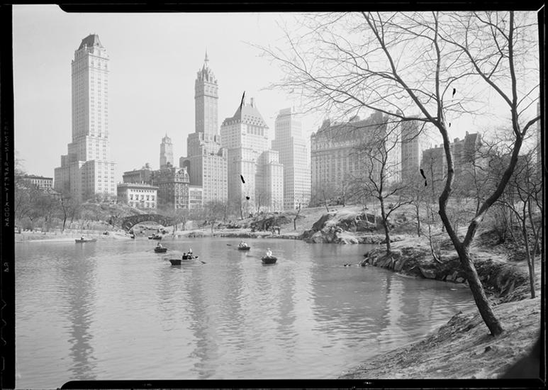 New York City views. 59th Street skyline over lake and fountain [in Central Park]. Framed by tree.