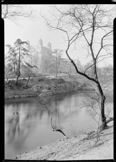 New York City views. Central Park, pond between rocks, 59th Street buildings.