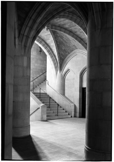 Riverside Church. Vista down fireplace loggia, 9th floor.