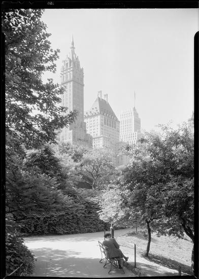 New York City views. 59th Street skyline over fountain from Goethe statue [in Central Park].