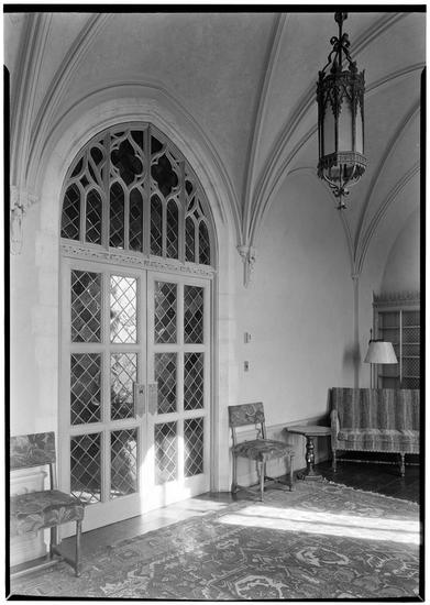 Riverside Church. Vista down fireplace loggia, 9th floor.