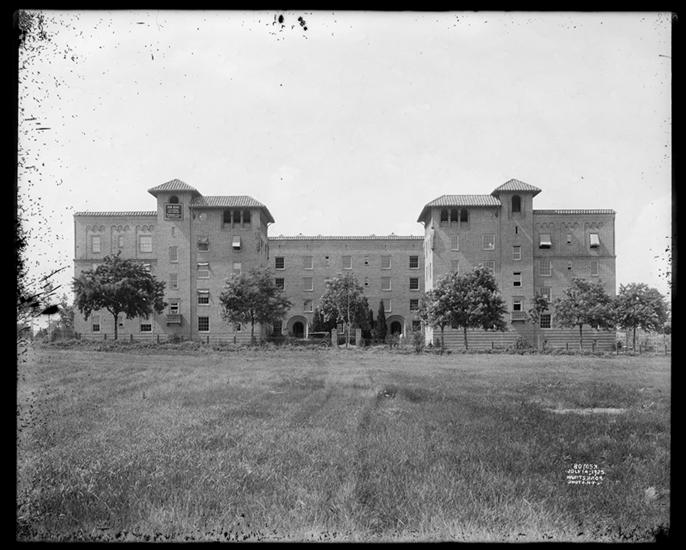 Cedar Court, view of open space between two adjacent apartment entrances.