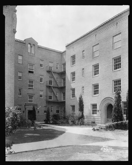 [Hawthorne Court. Apartment entrance and garden with children.]