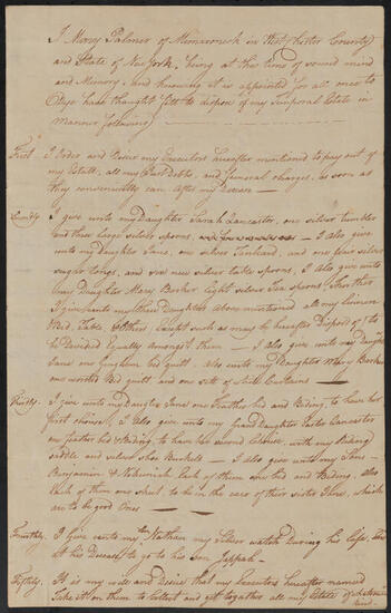 Copy of the will of Samuel Palmer, given March 18, 1712-1713, inscribed by Richard Hatfield, September 18, 1800