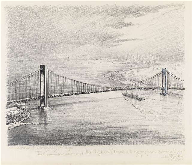 Verrazano Narrows Bridge. Construction view from John Paul Jones Park