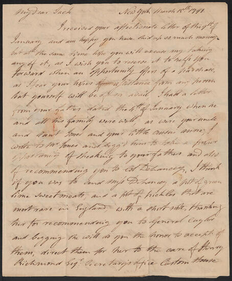 Letter from John Peter De Lancey to Thomas Jones and Anne De Lancey Jones, March 6, 1792