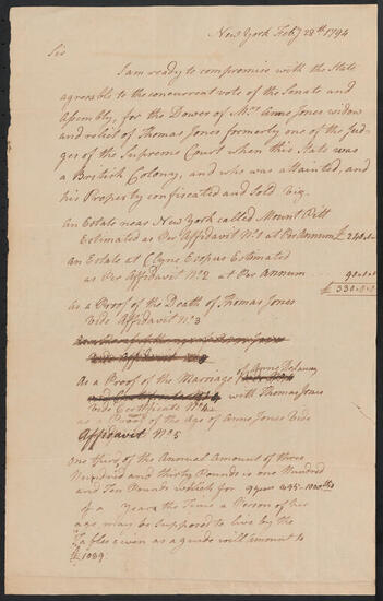 Affidavit of John Peter De Lancey to the State of New York concerning monies owed to the estate of Thomas Jones, February 25, 1803