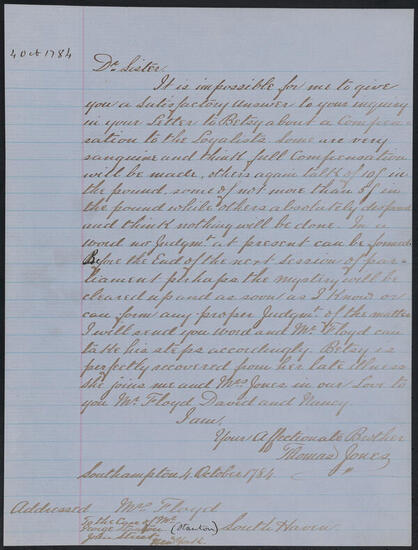 Letter from Thomas Jones to Arabella Jones Floyd, November 4, 1783