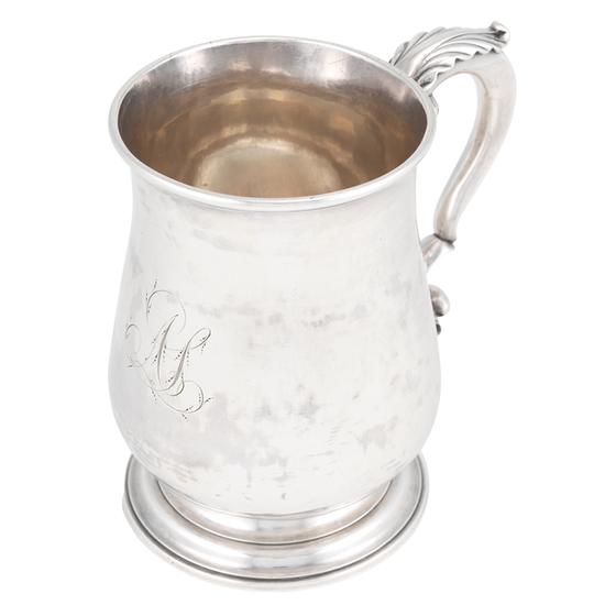 Cann with tulip-shape body and everted lip, on circular foot, and double-scroll handle with acanthus-leaf furl grip. Inscription: On underside of base: "AP" in block caps; Later initials in flowered script on body: "AL". Mark: Struck twice in script on underside of base: "Myers".