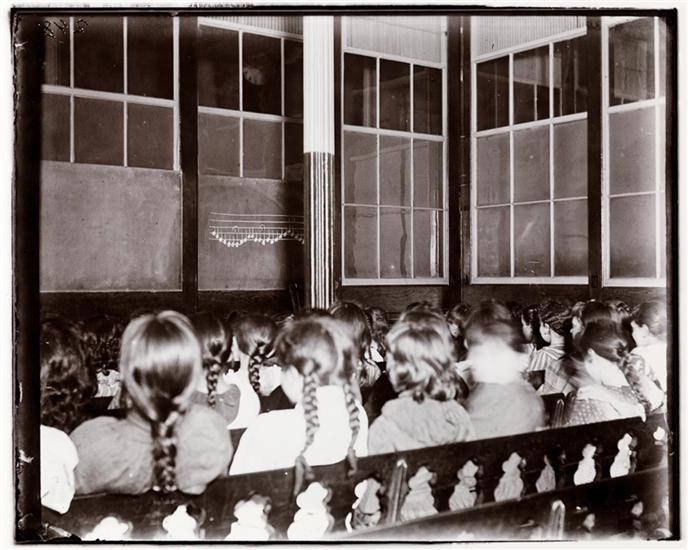 East Side Public Schools 1. A class in the condemned Essex Market School, Gas burning by day.