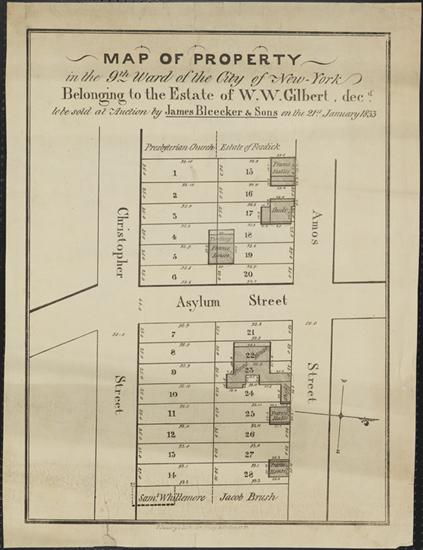 Map of Property in the 9th Ward in the City of New - York Belonging to the Estate of W. W. Gilbert, decd. to be sold at Auction by James Bleecker & Sons on the 21st January 1833.
