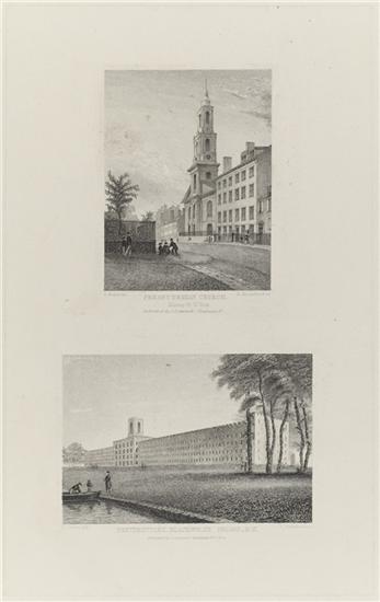A. The City Hotel Broadway; B. Grace, & Trinity Churches.