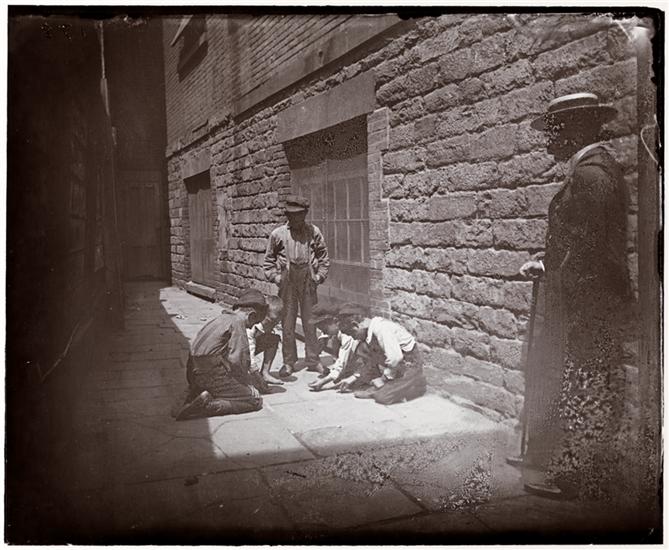 "Shooting craps" in the hall of the Newsboys' Lodging House.