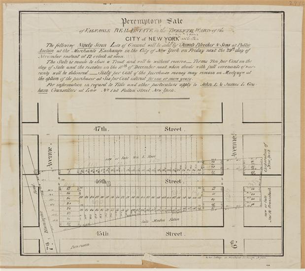 Map of Lots on the 3rd Avenue & 39th Streets and on the old Post Road being part of the Estate of the late John Duffie to be sold at Auction at the Merchants Exchange on Wed. 27th Novr 1833.