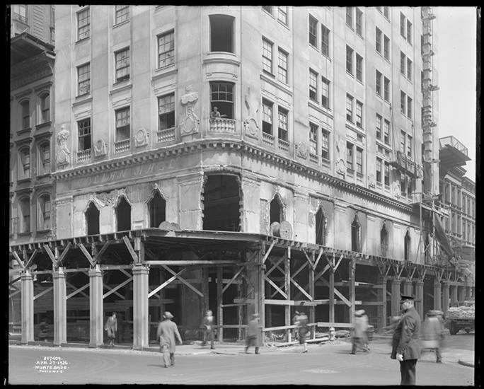 54th Street at the N.E. corner 5th Avenue. Aeolian Building showing fire damage.