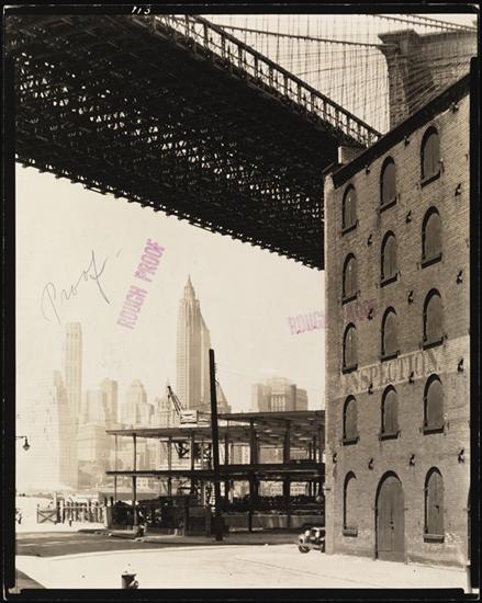 Description The Tobacco Inspection Warehouse (right), the skeletal structure of the Department of Purchase Storehouse, the Brooklyn Bridge and the Manhattan skyline beyond.