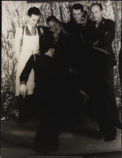 Embossed on recto: PHOTOGRAPH BY / CARL VAN VECHTEN; in ink, on verso: Stage Door Canteen / Dancers: USCG Frank Piro (Killer Joe) / Seaman Charles S. Sebree / Back Row: Busboy Phil Denman / Seaman Owe