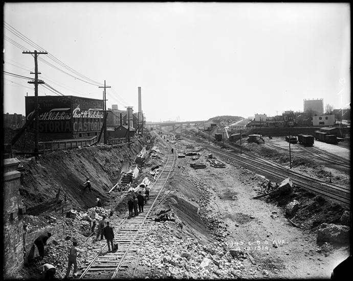 Sea Beach Line cut supporting building foundation, Fort Hamilton Parkway.