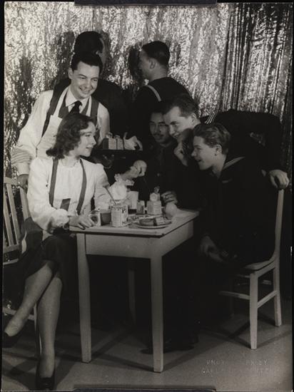 Embossed on recto: PHOTOGRAPH BY / CARL VAN VECHTEN; in ink, on verso: Stage Door Canteen / Back Row. Busboy Saul Sourikes / Corp. Wm. Romey / British Sailor Arthur James Lewis / Seated: Junior hostes