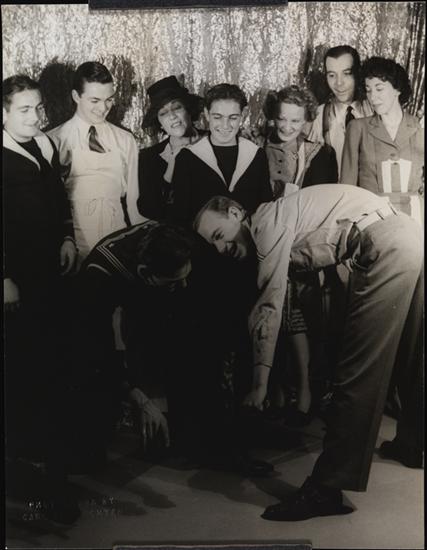 Embossed on recto: PHOTOGRAPH BY / CARL VAN VECHTEN; in ink, on verso: Stage Door Canteen / Dancers: USCG Frank Piro (Killer Joe) and Sergeant Richard Mulligan / Back Row: Lucien (French Sailor from t