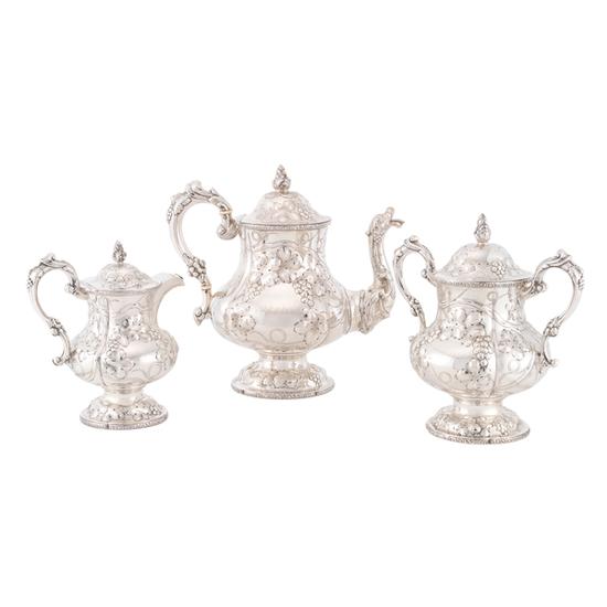 Pyriform teapot with four vertical lobes and everted lip edge with die-rolled scroll-and-floral border on circular domed foot edged with die-rolled scroll-and-floral border. Body ornamented with naturalistic repoussé-chased grapevine and grape clusters creating reserves on each side. Cast S-scroll handle with pendant grape clusters, ivory insulators inserted in teapot handle. Domed cover ornamented with repoussé-chased grapevine and grape clusters surmounted by bud-like cast finial, and cast pot spout with grape clusters and tendrils ending in dragon's head with extended tongue. Inscription: Engraved within reserve on body, in script: JJAK. Mark: Marked on underside of base: C. G. Stone / 188 Canal.