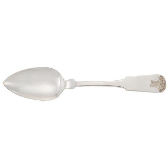 Tablespoon with downturned, broad fiddle handle, rounded shoulders, pointed oval bowl with outlined shell on reverse, and die-struck sheaf of wheat decoration on handle obverse. Mark: Struck on shank reverse: W&H STERLING / VOORHEES & VANWICKLE.