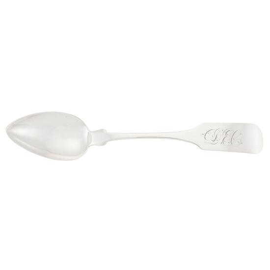 Dessert spoon with downturned back-tipped, with short back midrib, fiddle handle with flared shoulders and pointed oval bowl with broad bowl-back drop. Inscription: Engraved on handle obverse: DEC. Mark: Struck on handle reverse: WHITNEY & HOYT.