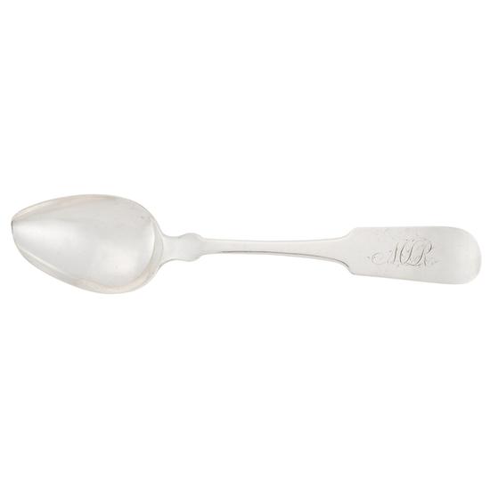 Tablespoon with downturned, back-tipt rounded fiddle handle, incised broad-based back drop, pointed oval bowl, and flared shoulders. Inscription: Engraved on handle obverse, in script: MLR. Mark: Struck on handle reverse: JOHN H. ATKIN. / N.Y.