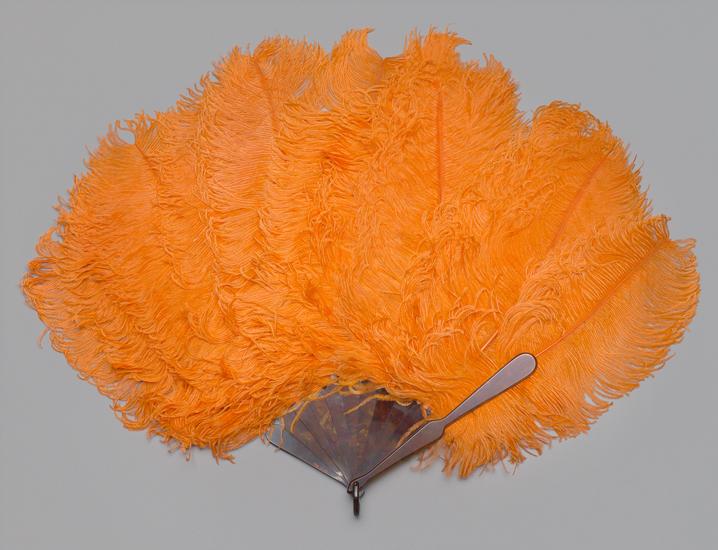 Folding feather fan of shaded orange ostrich